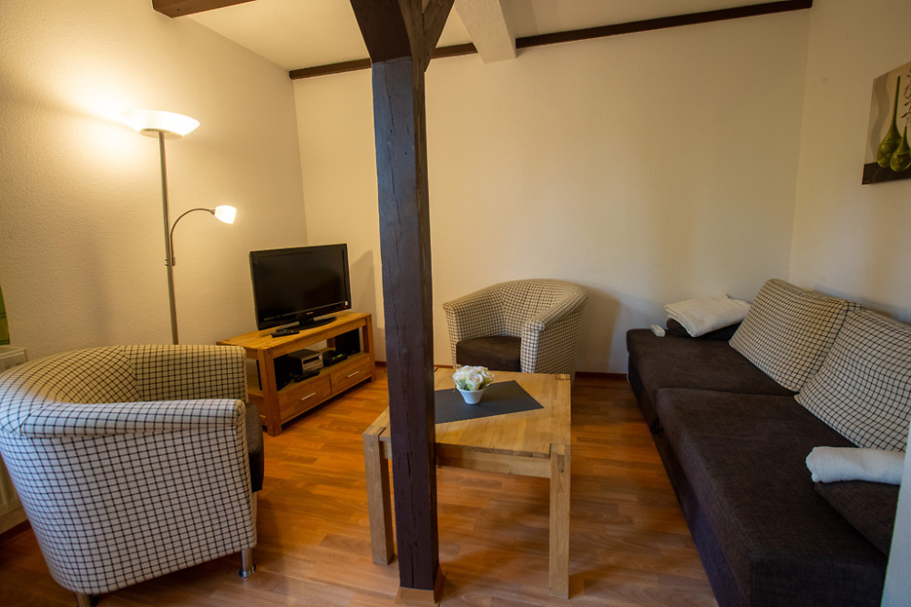 Die Wohnung verfügt über zwei Schlafräume mit einem Doppelbett und zwei Einzelbetten. Das große Wohnzimmer mit gemütlicher Sitzgruppe und kombinierter Schlafcouch für zwei Personen bietet auch einen großzügigen Essbereich für maximal sechs Personen. Ein Fernseher und eine Musikanlage gehören ebenfalls zur Ausstattung. Die Küche beinhaltet eine moderne Einbauküche inkl. Cerankochfeld, Kühlschrank, Kaffeemaschine, Wasserkocher, Toaster, Geschirr, Gläsern, Töpfen und Besteck.